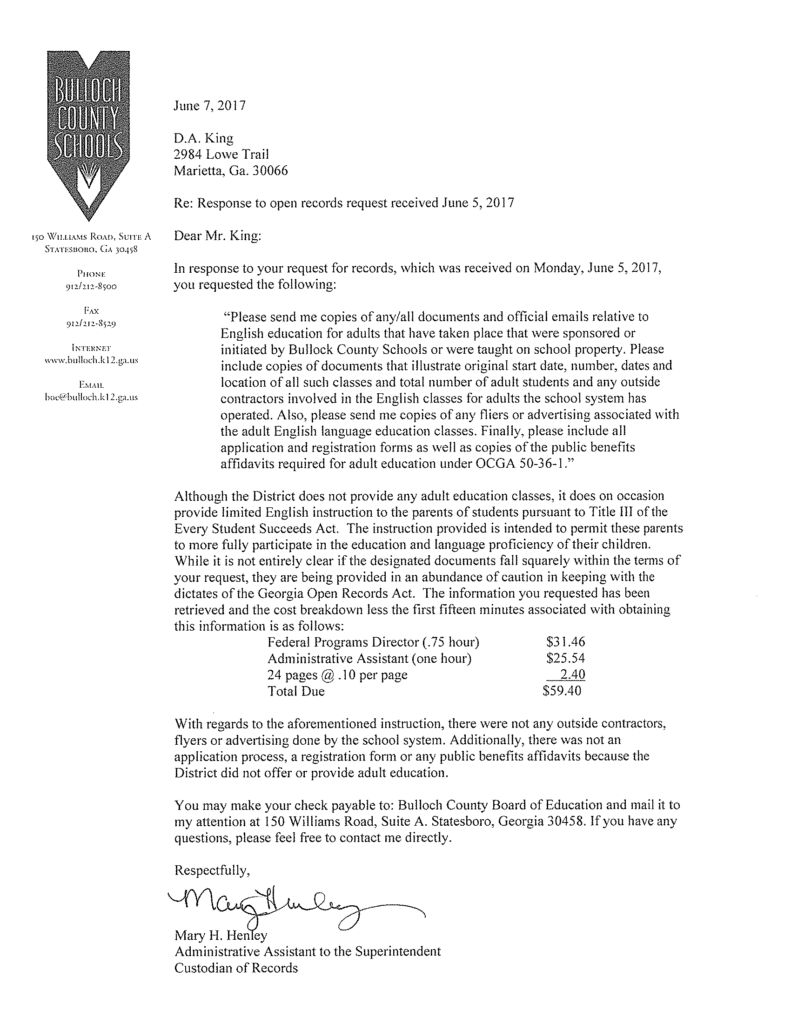 12 June 2017 The below was just successfully sent to DeKalb BOE on its website’s open records submission page. Open records request To whom it may concern: Including the documents attesting to use of the federal E-Verify program, please send me copies of any/all documents that reflect the bidding process from contractors who were considered for the purpose of teaching English to the adult parents of students in the K-12 system of DeKalb Board of Education. Please also include the E-Verify affidavit collected from the contractor hired for this purpose, Literacy Action Inc., 100 Edgewood Ave NE #600, Atlanta, GA 30303 as required under language of OCGA 13-10-91. Thank you, D.A. King